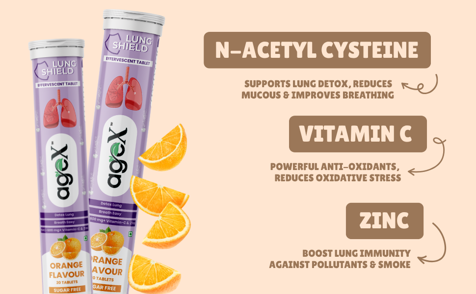 AgeX Lung Shield Effervescent Tablets are expertly formulated to support daily lung health, especially for individuals exposed to urban pollution and smokers. Each sugar-free tablet delivers 600mg N-Acetyl Cysteine (NAC), 40mg Vitamin C, and 10mg Zinc to help detoxify lungs, break down mucus, and promote easier breathing.