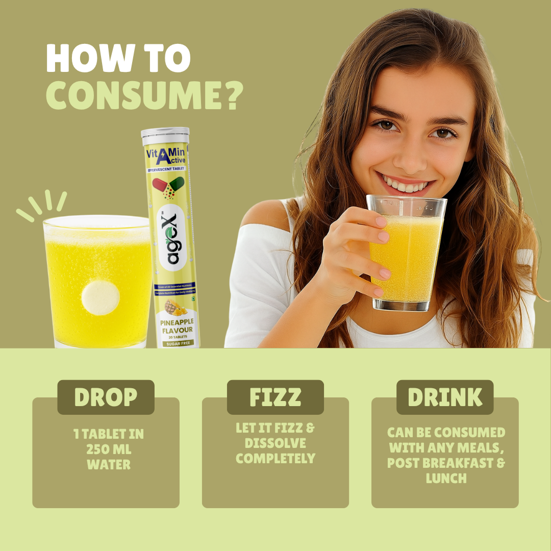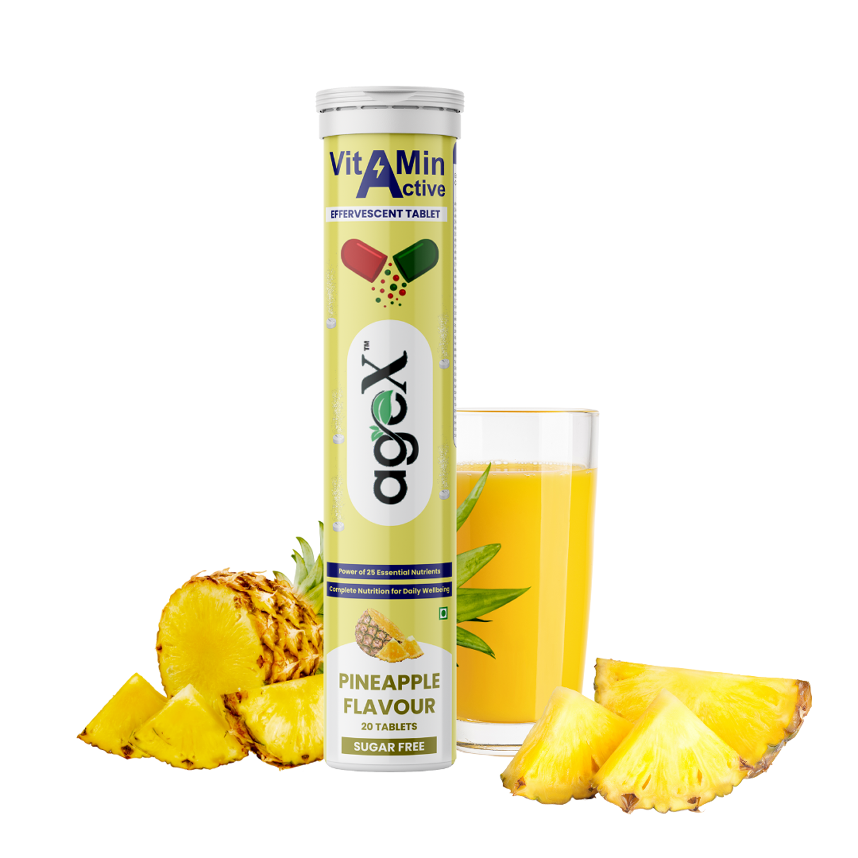 AgeX Vitamin Active Effervescent Tablets deliver 21 essential vitamins and minerals—including Vitamin C, B‑complex, and Zinc—in a convenient, sugar‑free fizzy tablet infused with natural pineapple flavor. This refreshing blend supports daily wellness by bridging nutritional gaps, boosting immunity, and providing sustained energy for both men and women. The effervescent format ensures fast dissolution in water, enhancing nutrient absorption and digestibility compared to traditional tablets . Simply drop one tablet into water after meals, let it fizz, and enjoy a revitalizing drink that supports your active lifestyle.